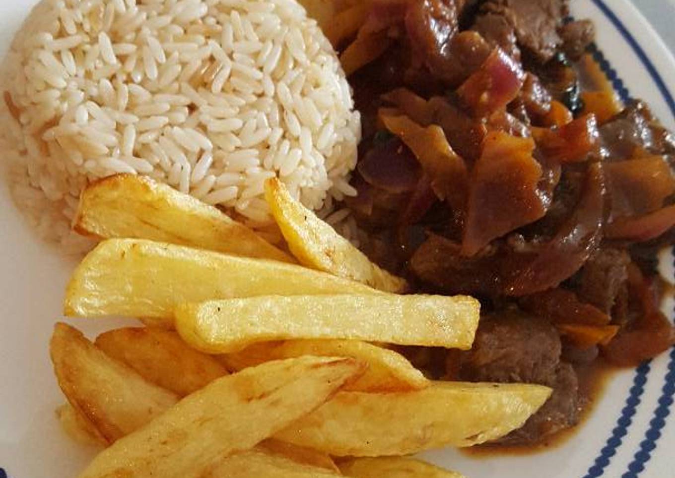 - Sirve el lomo saltado bien caliente en un plato con arroz blanco y las papas fritas. Listo el lomito peruano!😉 Let's eat🍷
