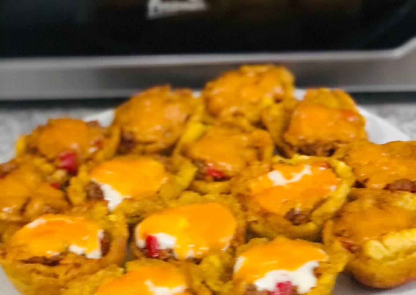 - Luego, será el momento de ir rellenándolas, le puse una cda de carne molida justa a cada una, solo le añadí aderezo a algunas (ya que a mis niños no le gusta) y le coloqué un poquito de queso por encima.