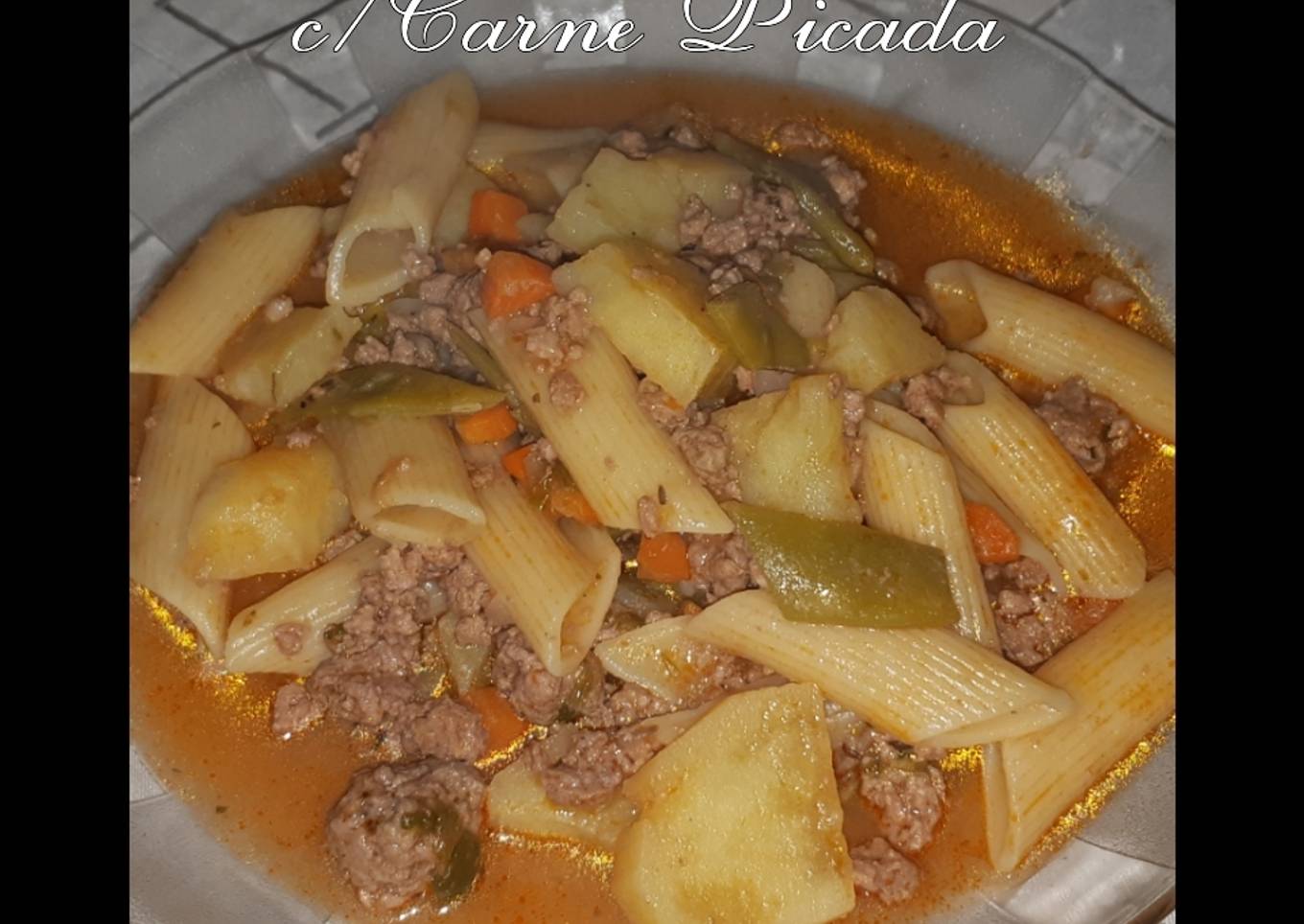 - Picar las verduritas, poner a rehogar un ratito, agrego la carne, condimentar revolvemos, dejamos cocinar unos 10 minutos aproximadamente agrego las papas cortaditas, un poquito de salsa y el agua, dejamos hasta que haga hervor y ahí le agrego los Mostacholes revolvemos y dejamos cocinar por 15 minutos aproximadamente...