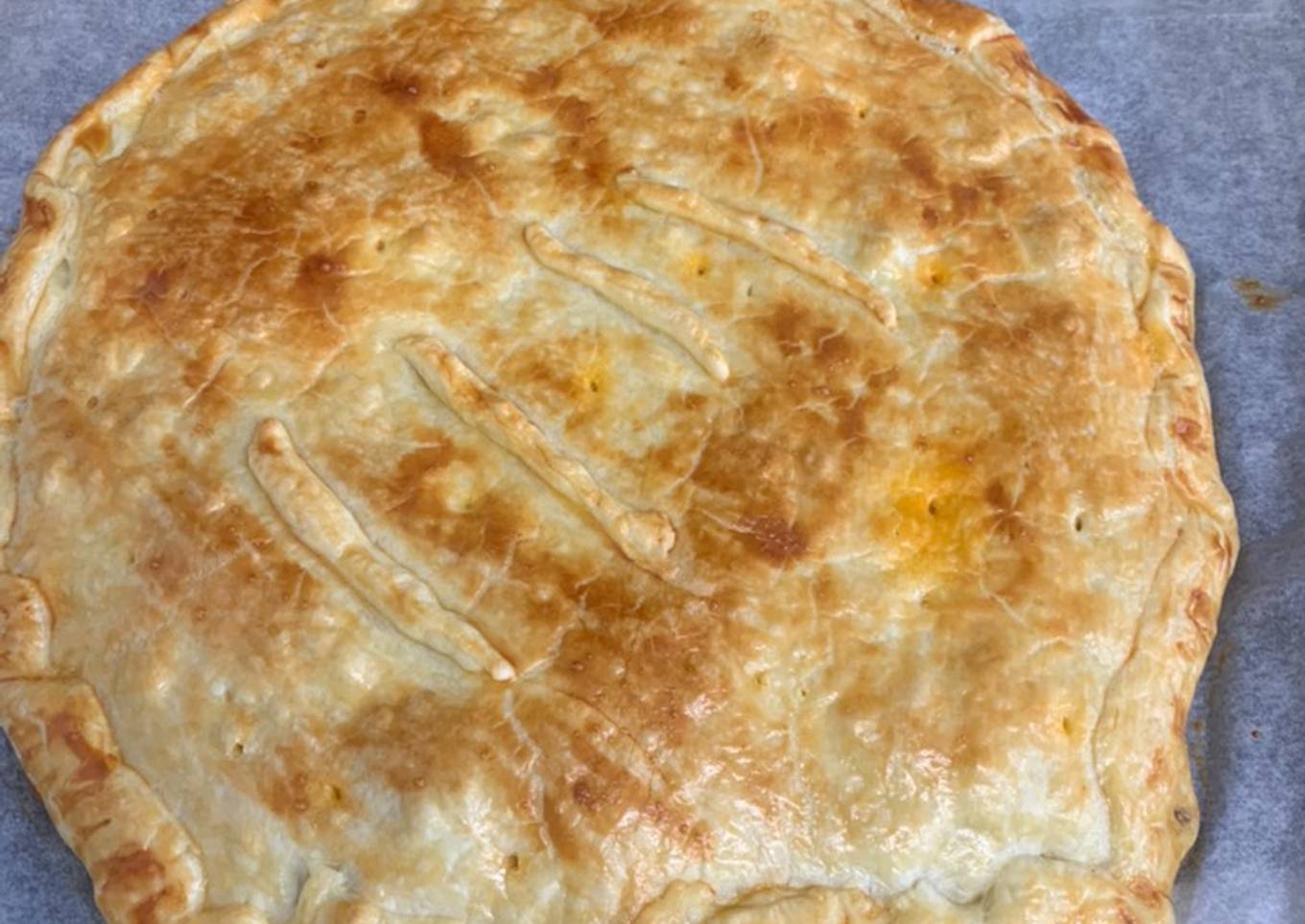 - Tapamos con otra lámina de hojaldre y la pintamos con huevo batido para que se dore mejor en el horno y pinchamos la parte de arriba para que no se bufe y se haga bien por dentro